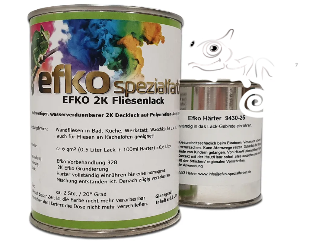 Unser Efko 2K Fliesenlack eignet sich für alle keramischen senkrechten Oberflächen, wie z.B. Wandfliesen in Bad, Küche, Werkstatt, Waschküche u.v.m. - auch für Fliesen an Kachelöfen geeignet!