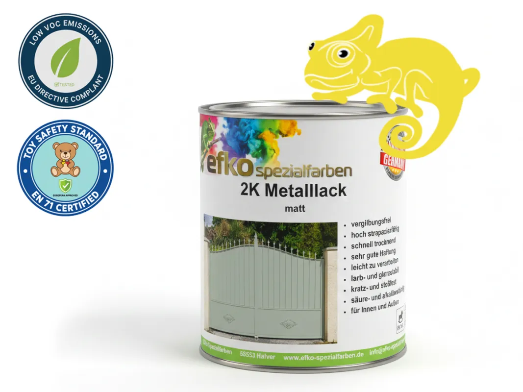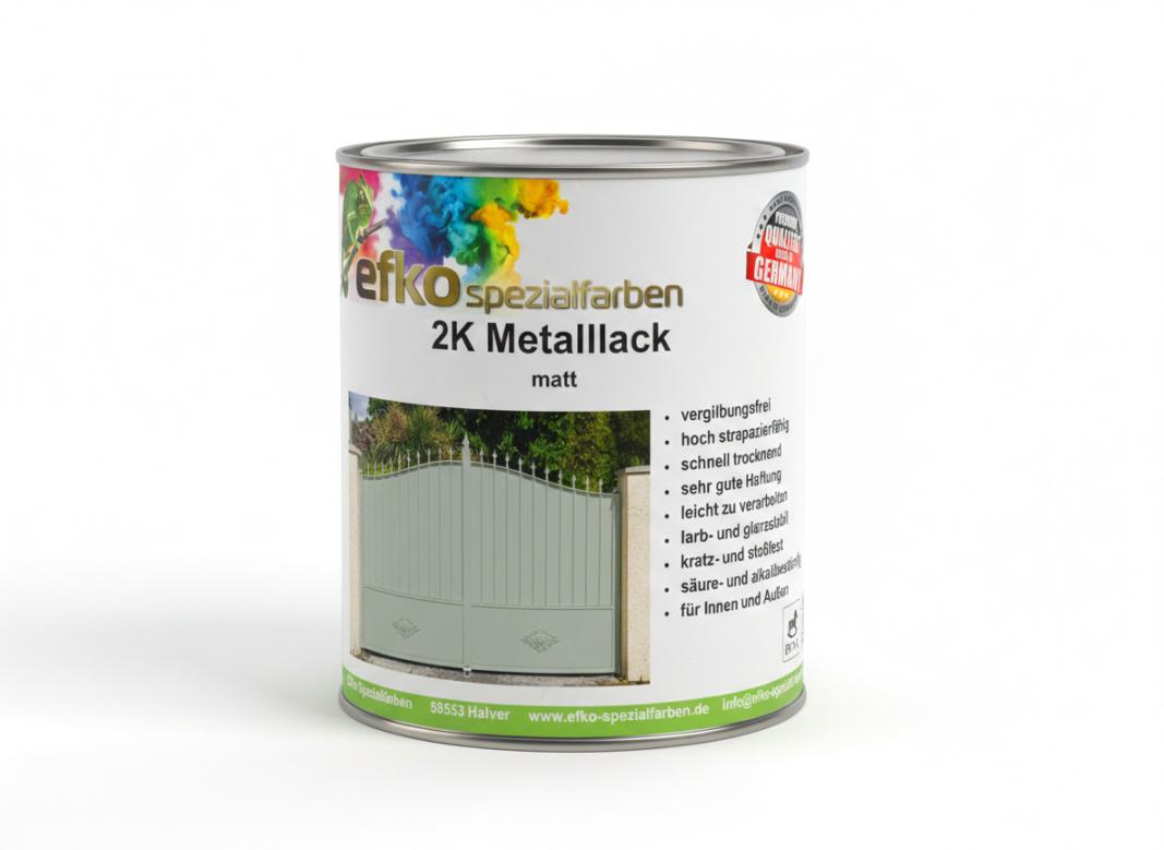 Wähle dein Wunsch-Finish: Matt oder eleganter Seidenglanz! Spezialformel für höchste Kantenabdeckung und perfekten Verlauf auf Metall! Warum der Efko 2K Metalllack in RAL 1016 überzeugt