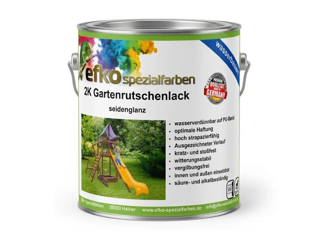 Der Gartenrutschenlack ist eine hochwertige Zwischen- und Schlussbeschichtung, die zwingend eine zusätzliche Versiegelung mit EFKO 2K Klarlack benötigt, um die volle mechanische Belastbarkeit zu garantieren.