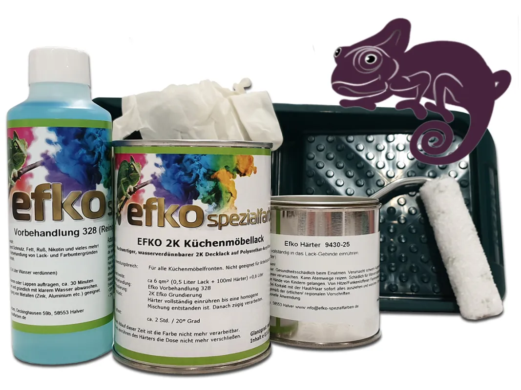 Der EFKO 2 Komponenten Küchenmöbellack in purpurviolett zeichnet sich durch milden Geruch bei der Verarbeitung, konsequente An- und Durchtrocknung sowie Füllkraft aus. Er dient dem Anstrich von allen Küchenoberflächen - für Komplettanstriche oder Renovierungsanstriche (nicht für den Einsatz auf Küchenarbeitsplatten geeignet).