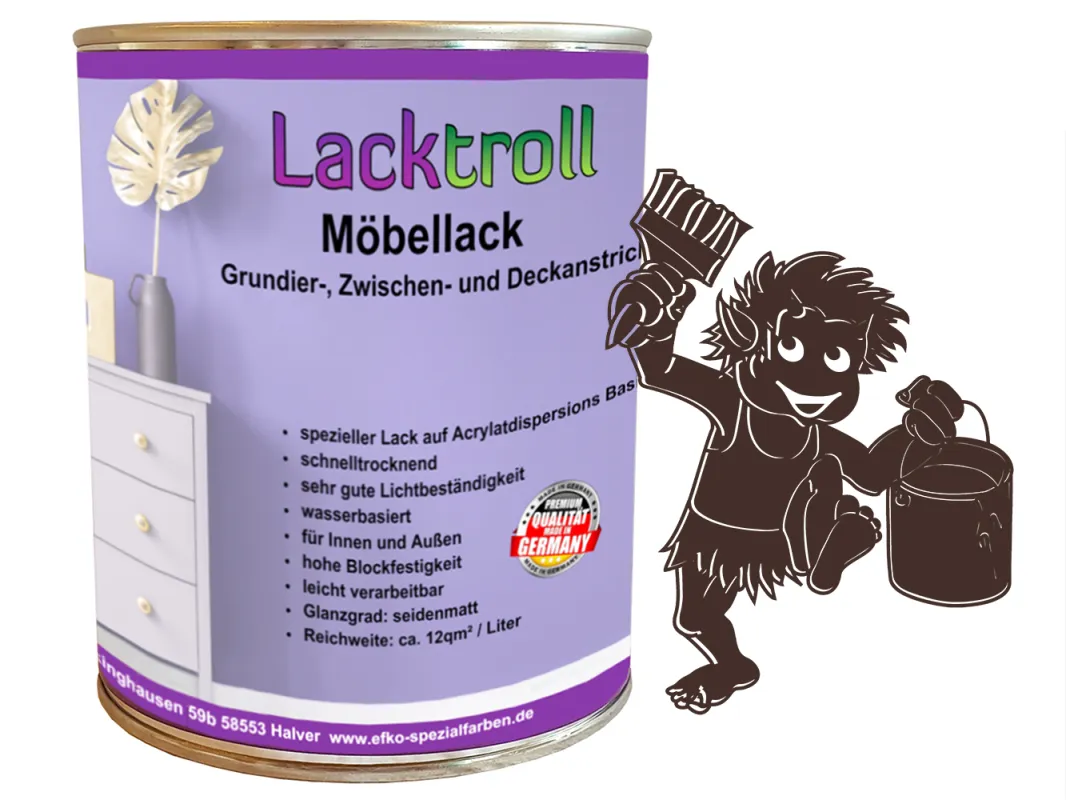 Unser Lacktroll Möbellack 3in1 in schokoladenbraun ist Grund-, Zwischen- und Deckanstich in einem und eignet sich für sämtliche Holzmöbel im Innen- und Außenbereich, wie Gartenmöbel, Kinderzimmermöbel, Regale, Schuhschränke uvm.