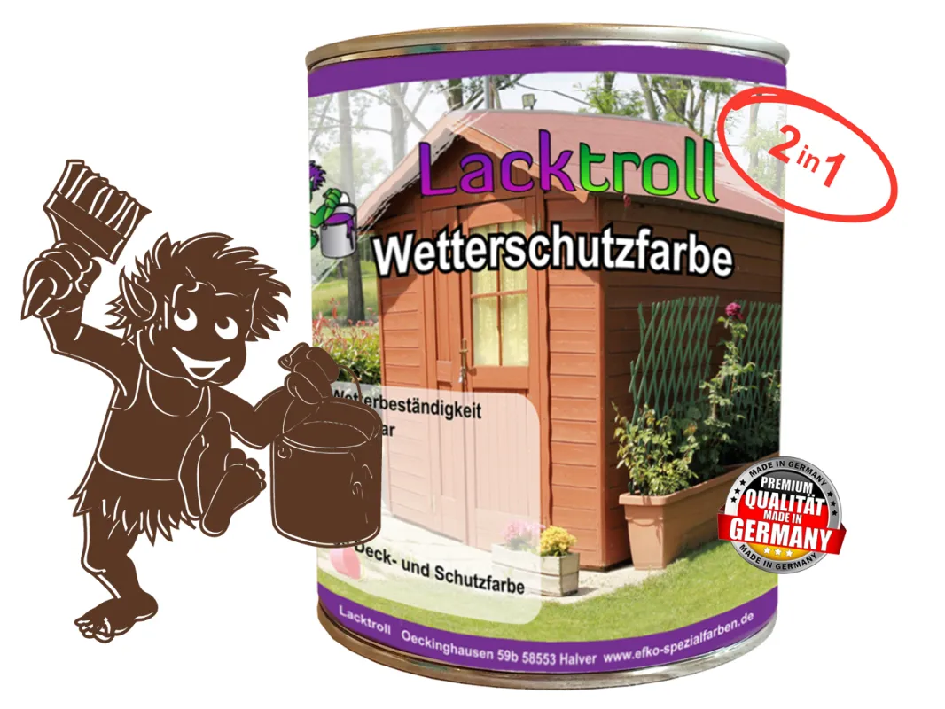 Unsere hochwertige Lacktroll Wetterschutzfarbe 2in1 ist eine Speziallackfarbe für Holz und wetterfeste Holzwerkstoffe mit hoher Beanspruchung im Außenbereich, außerdem für Kunststoffe, Aluminium, verzinktes Blech u.m. mit entsprechender Vorbehandlung.