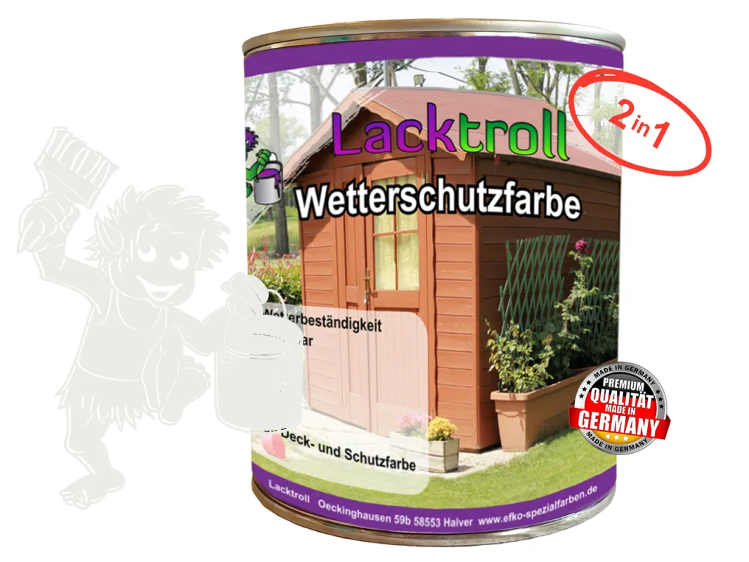 Unsere hochwertige Lacktroll Wetterschutzfarbe 2in1 ist eine Speziallackfarbe für Holz und wetterfeste Holzwerkstoffe mit hoher Beanspruchung im Außenbereich, außerdem für Kunststoffe, Aluminium, verzinktes Blech u.m. mit entsprechender Vorbehandlung.